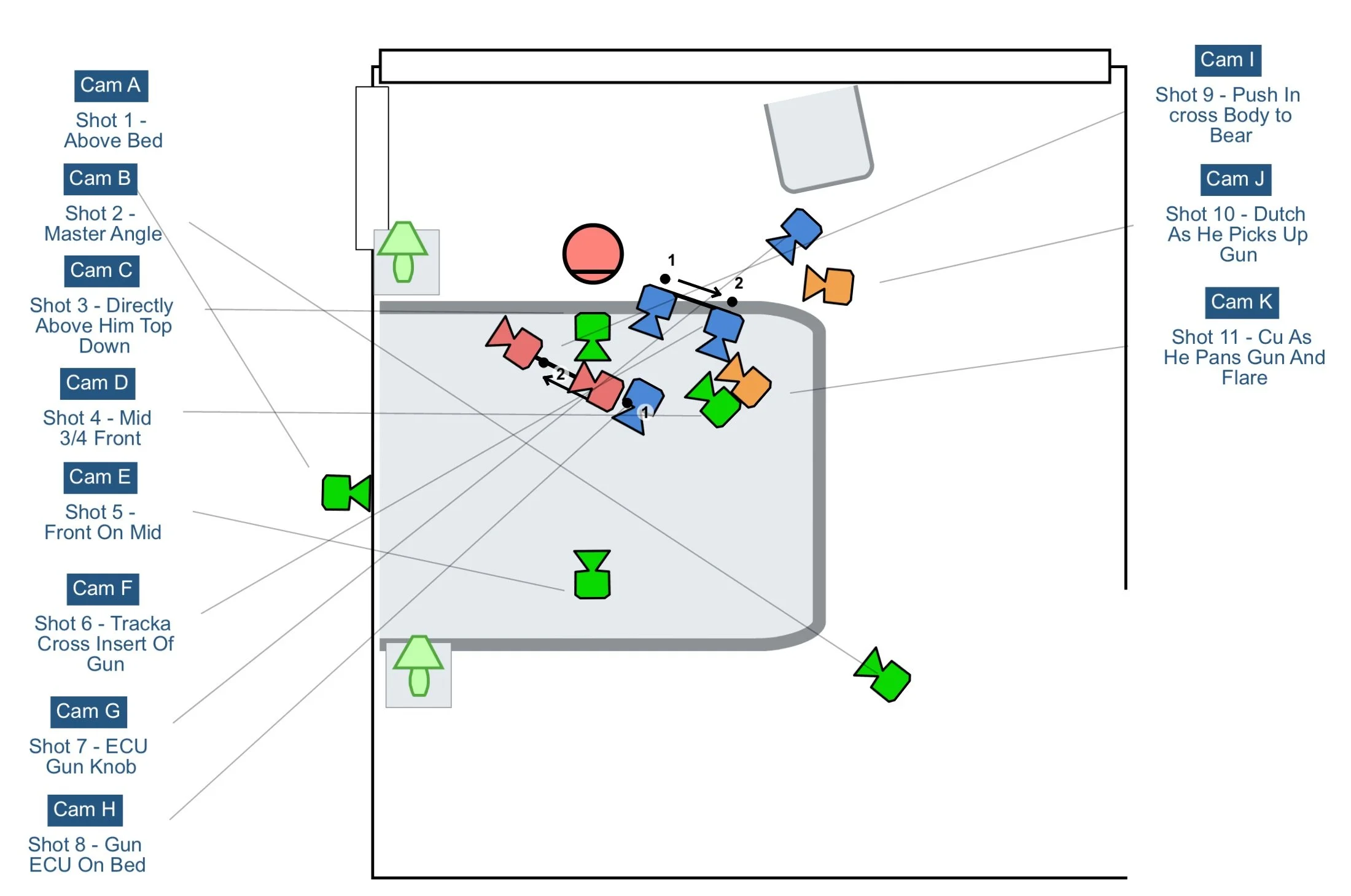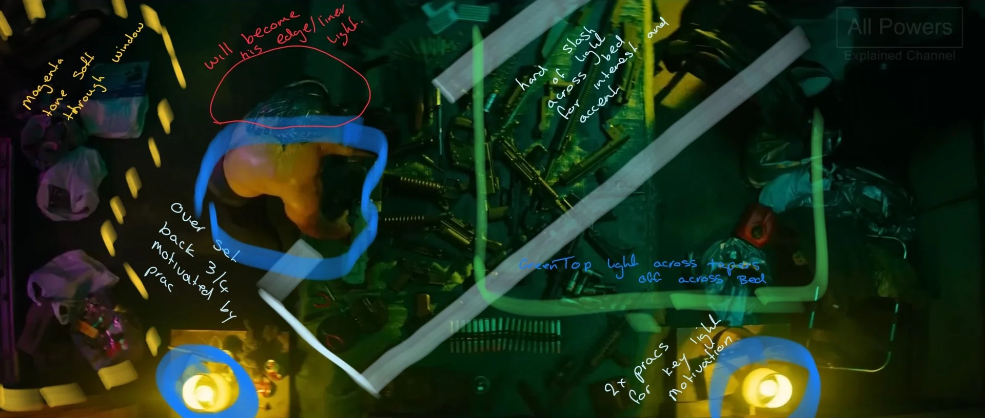 An ambient top light over the scene, in the top down shot it looks as though it has been tapered across the bed towards the left of frame, making the strongest portion being the right of frame. This could be for a few reasons but more likely than not it is to give some depth to a top down shot….which is very hard. I would imagine (as I can’t find any BTS online) is that this scene is a stage build and they have a large textile/rag above the set, maybe with a grid to stop it spilling around and a few soft LED units like sky panels over the top and all they have done for this top down is lowered the intensity on the lamps towards the left of frame to lower the fill and give that side some more contrast. It would also help not to mix with that magenta tone coming through the windows and the lights on cable.